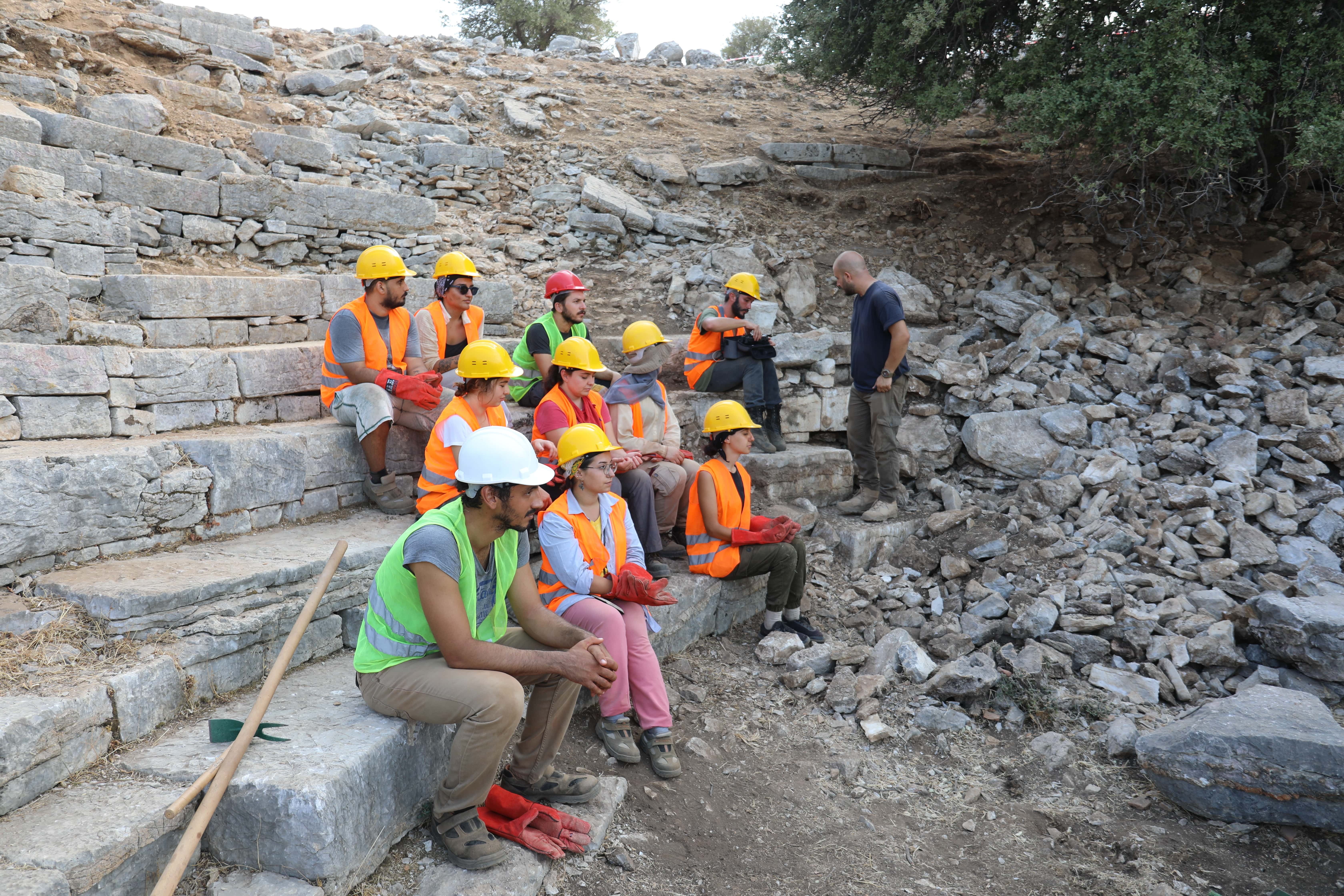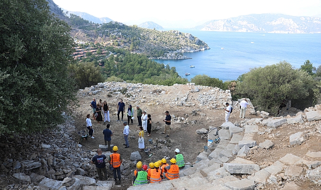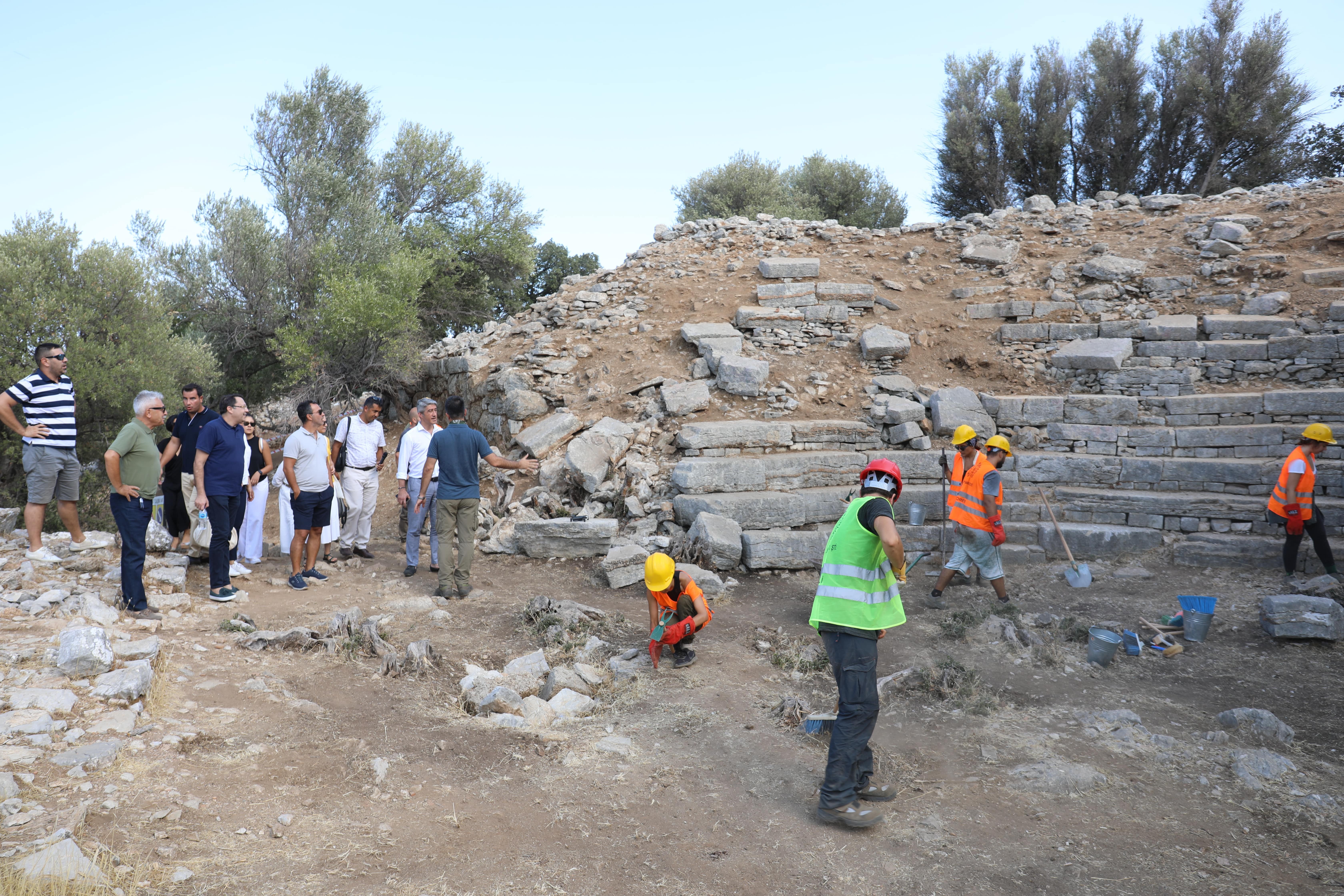Marmaris Belediye Başkanı Mehmet Oktay ve Marmaris Ticaret Odası Başkanı S. Mutlu Ayhan da alanda incelemelerde bulunarak kazı başkanı Arkeoloji Bölümü"> MSKÜ Arkeoloji Bölümü Öğretim Üyesi Dr. Mehmet Gürbüzer ve arkeoloji ekibinden bilgi aldı. İnceleme gezisine Belediye Meclis üyeleri, Ticaret Odası Meclis Başkanı Nurgül Candan ve Meclis üyeleri de katıldı. Çalışmalarla ilgili bilgi veren Dr. Gürbüzer, tiyatro alanının Bozburun yarımadası için çok özel bir önemi olduğunu vurgulayarak, “Amos Kazısı 2022 yılı çalışmaları kentin sembol yapılardan biri olan tiyatroda sürdürülmektedir. Bozburun Yarımadası’nda sayısı 10’u geçen antik kentler içerisinde bir tiyatrosu olan tek kent olma özelliğine sahip Amos yaklaşık 1000 kişilik tiyatrosu ile tarih boyunca sanata verdiği önemi gözler önüne sermektedir. M.Ö. 2. yüzyılda inşa edilmiş olan tiyatronun, yapılan son araştırmalar neticesinde iki evreli olduğu anlaşılmaktadır. İlk evresinde tek katlı bir sahne binasına sahipken, ikinci evrede sahne binası iki katlı yapılarak orkestra ikinci kata taşınmıştır. Amos tiyatrosu, kendine özgü inşa tekniği ve konumu ile diğer birçok benzerinden ayrılmaktadır. Tiyatrodaki çalışmalar yıl boyunca kesintisiz olarak devam edecektir” bilgisini verdi.
