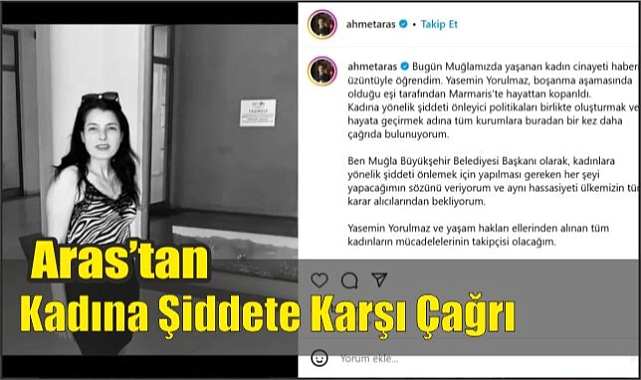 Ahmet Aras, kadına şiddete karşı politikalar oluşturup hayata geçirme konusunda söz verip diğer kurumlara da çağrı yaptı. Muğla Büyükşehir Belediye Başkanı Ahmet Aras, yaşanan cinayetin ardından Sosyal Medya Hesaplarından yaptığı paylaşımda kadına yönelik şiddeti önleyici politikalar oluşturup hayata geçirme konusunda her şeyi yapacağı sözünü vererek, diğer tüm kurum yöneticilerine de çağrıda bulundu.