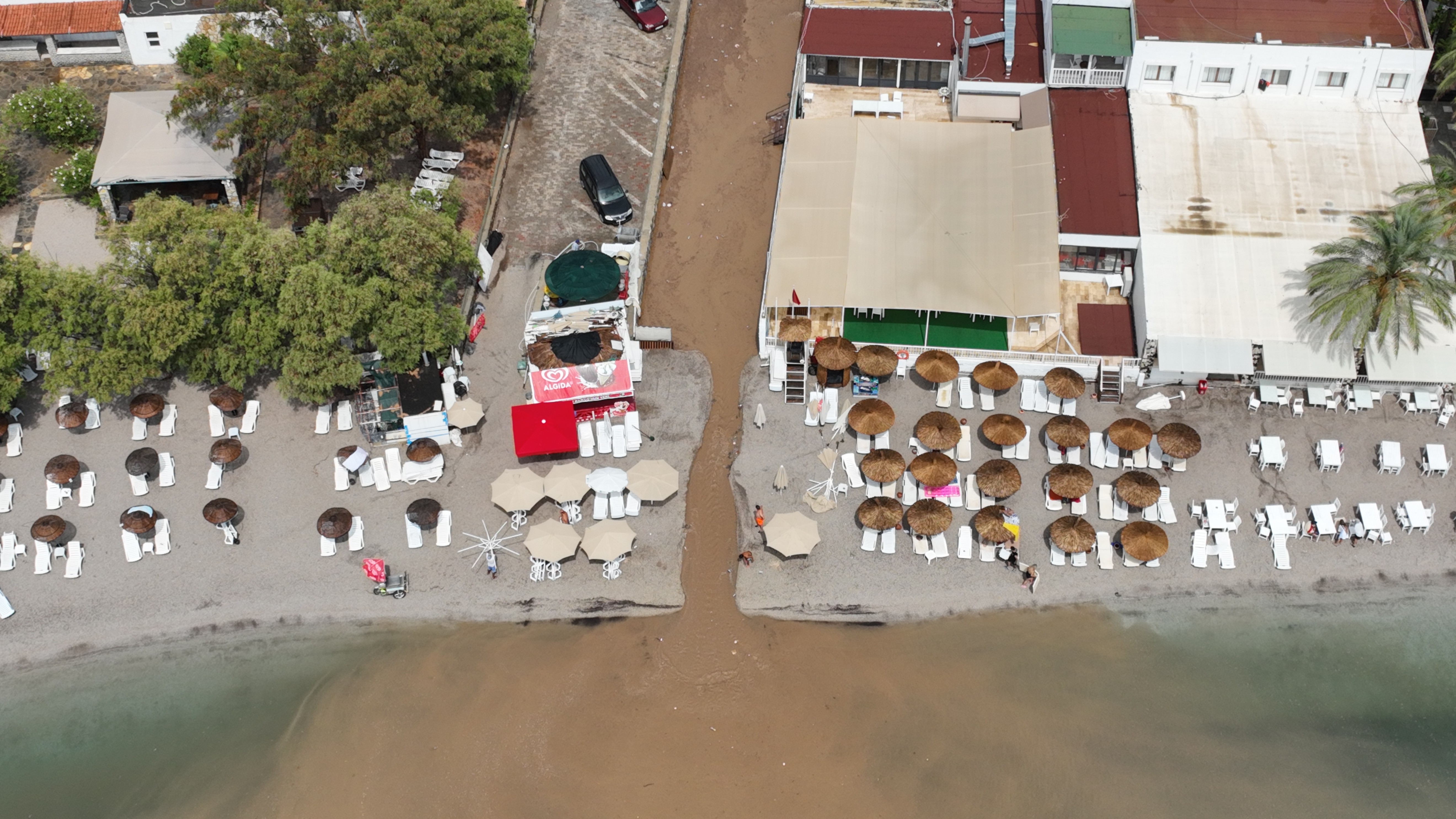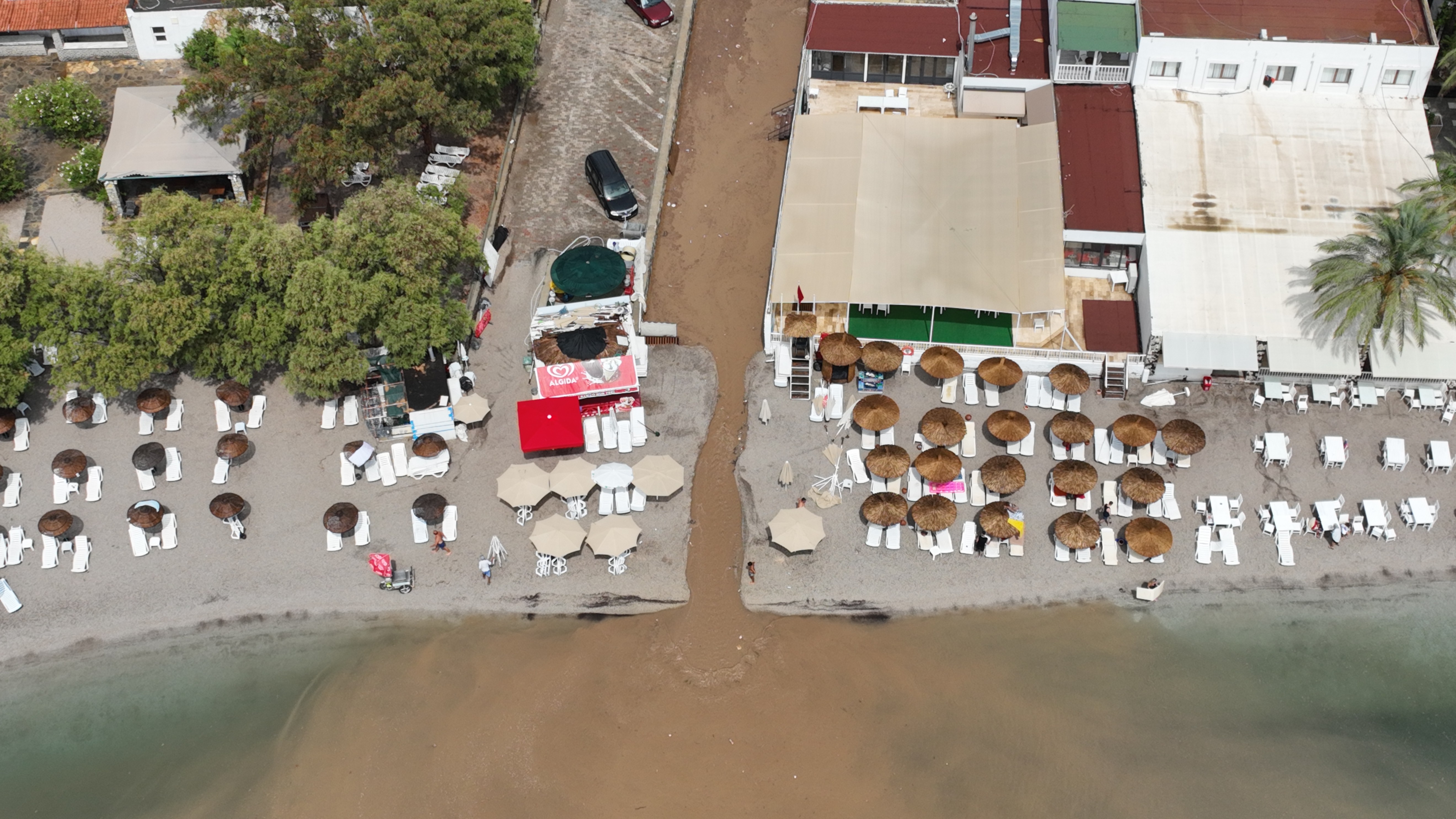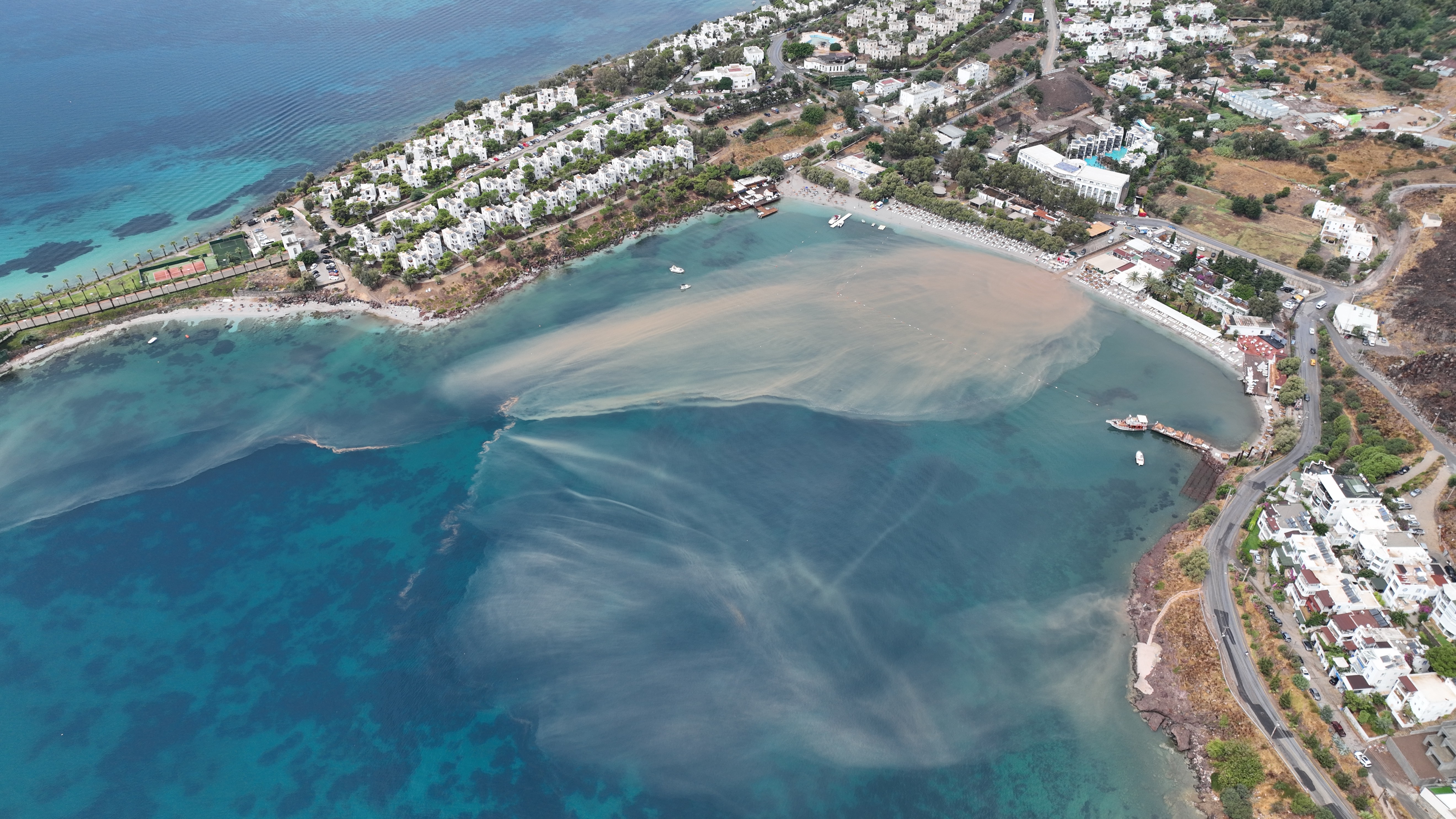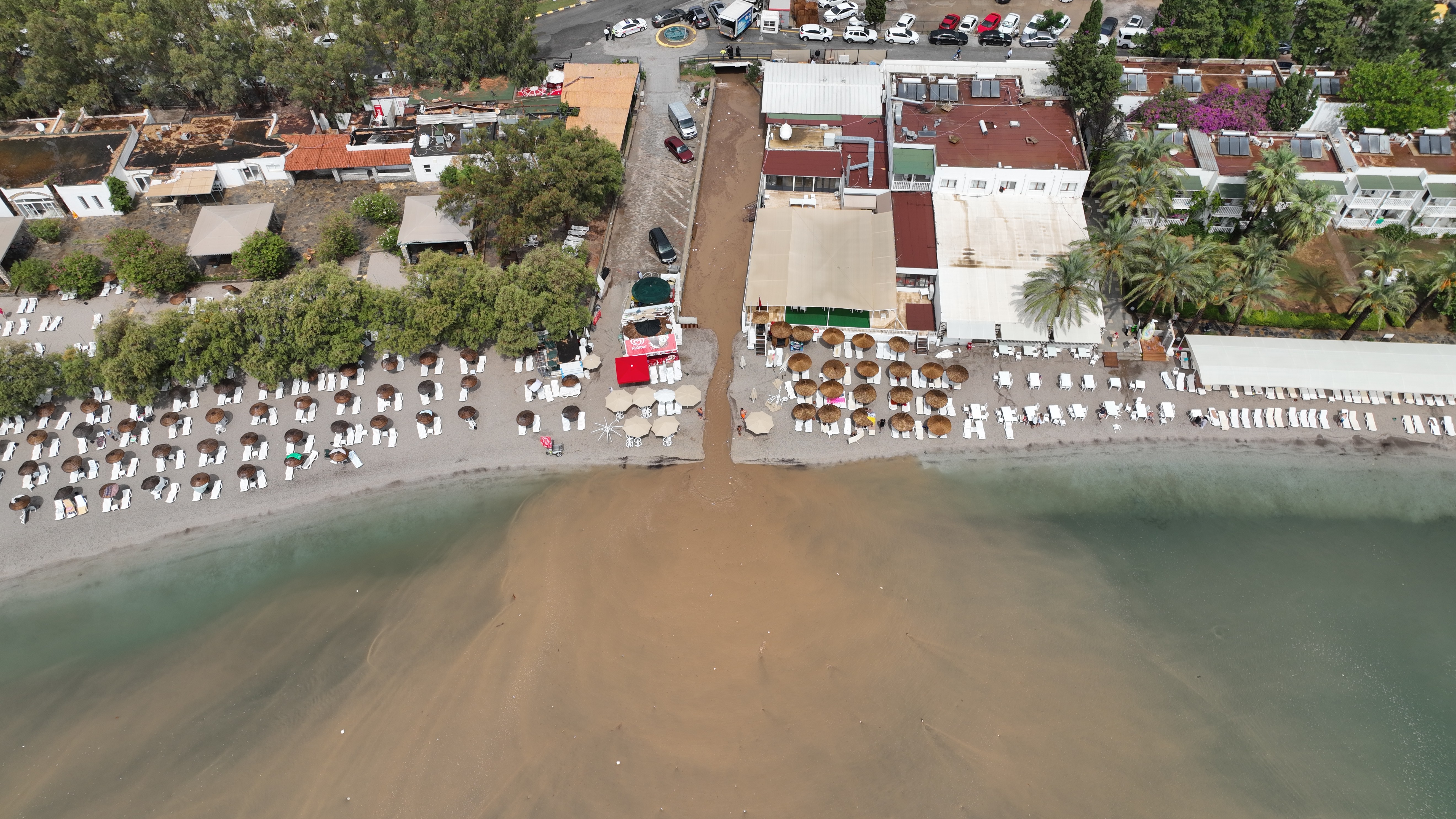 Yazın nüfusu 1 milyonu geçen turizm merkezi Bodrum'da sabah aniden bastıran sağanak yağış tatilcileri şok etti. Şiddetli yağmur sebebiyle çamur akan derelerin döküldüğü zümrüt yeşili cennet koylar çamur deryasına dönerken, o anlar havadan dron ile de görüntülendi. Bazı turistlerin çamura aldırış etmeden sağanak yağmur altında yüzmeleri dikkat çekti.