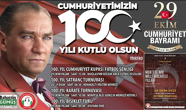 Menteşe Belediye Başkanı Bahattin Gümüş, Cumhuriyetin 100. Yılına özel hazırlanan etkinlikler ile ilgili yaptığı açıklamada şu ifadelere yer verdi: “Ata’mızın bundan tam 100 yıl önce kurduğu ve bizlere emanet ettiği Cumhuriyetimizin 100. Yılını Menteşemizde coşkuyla kutlayacağız. Bu kapsamda Cumhuriyetimizin 100. Yılına özel etkinlikler düzenledik. Kutlamalarımız ‘Evlerimizi Bayraklarla Donatıyoruz’ kampanyası ile başladı. Vatandaşlarımıza ücretsiz bayrak dağıtıyoruz. Etkinliklerimiz çerçevesinde Menteşe Belediye Tiyatrosu’nun “Menteşe’nin Milli Mücadele Yılları” adlı tiyatro gösterisini sahneye koyacağız. Ayrıca 100. Yıl Cumhuriyet Kupası Futbol Şenliği, 100. Yıl Satranç Turnuvası, 100. Yıl Karate Turnuvası ve 100. Yıl Bisiklet Turu etkinlikleri yapılacak. 29 Ekim akşamı ise Muğla Valiliğimiz tarafından fener alayı, ardından Muğla Büyükşehir Belediyemiz tarafından Cumhuriyet Meydanında Gripin konseri düzenlenecek. Tüm halkımızı Cumhuriyetimizin 100. Yılına yakışır bir şekilde kutlayacağımız bu güzel etkinliklere davet ediyorum.”