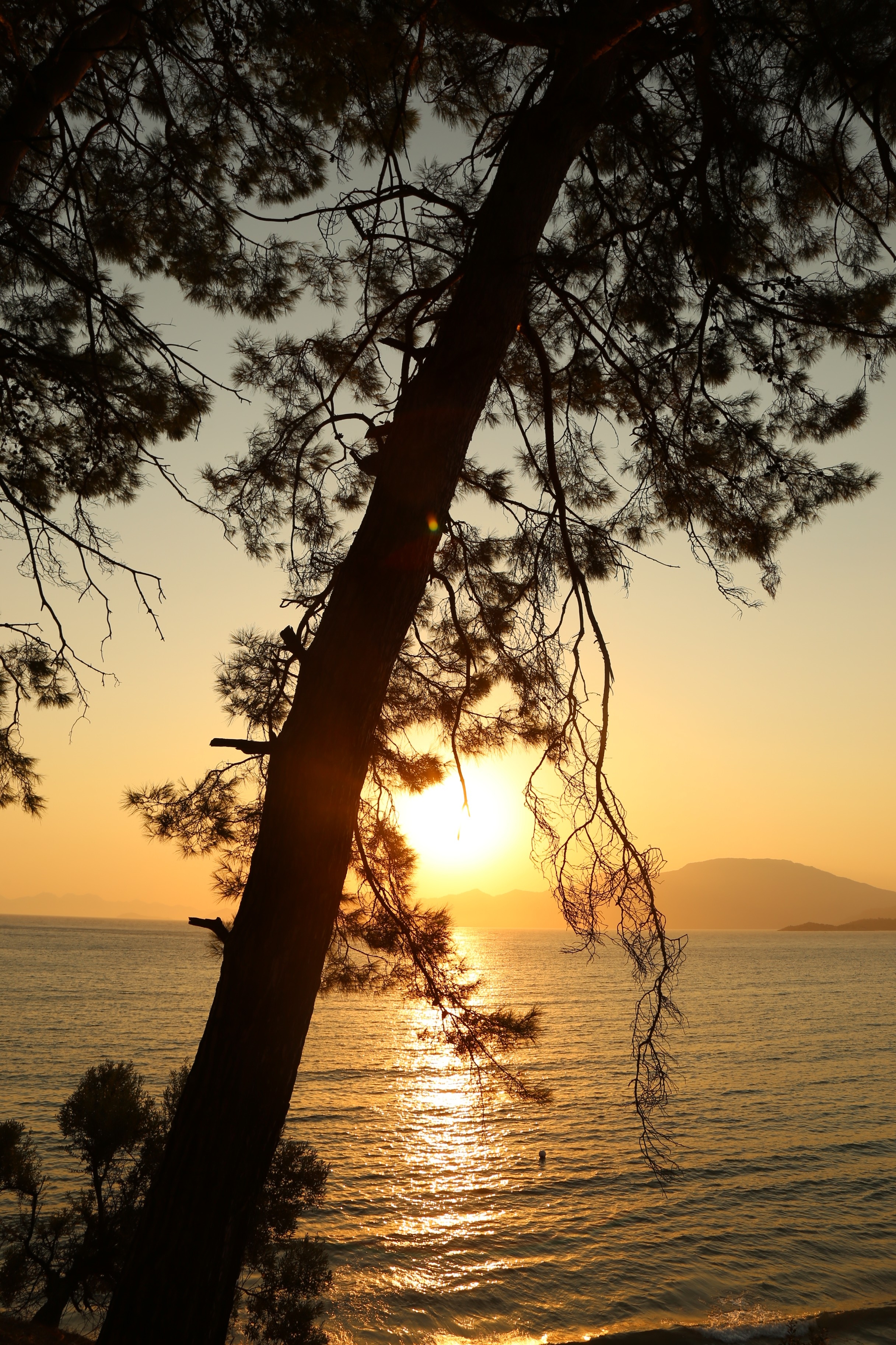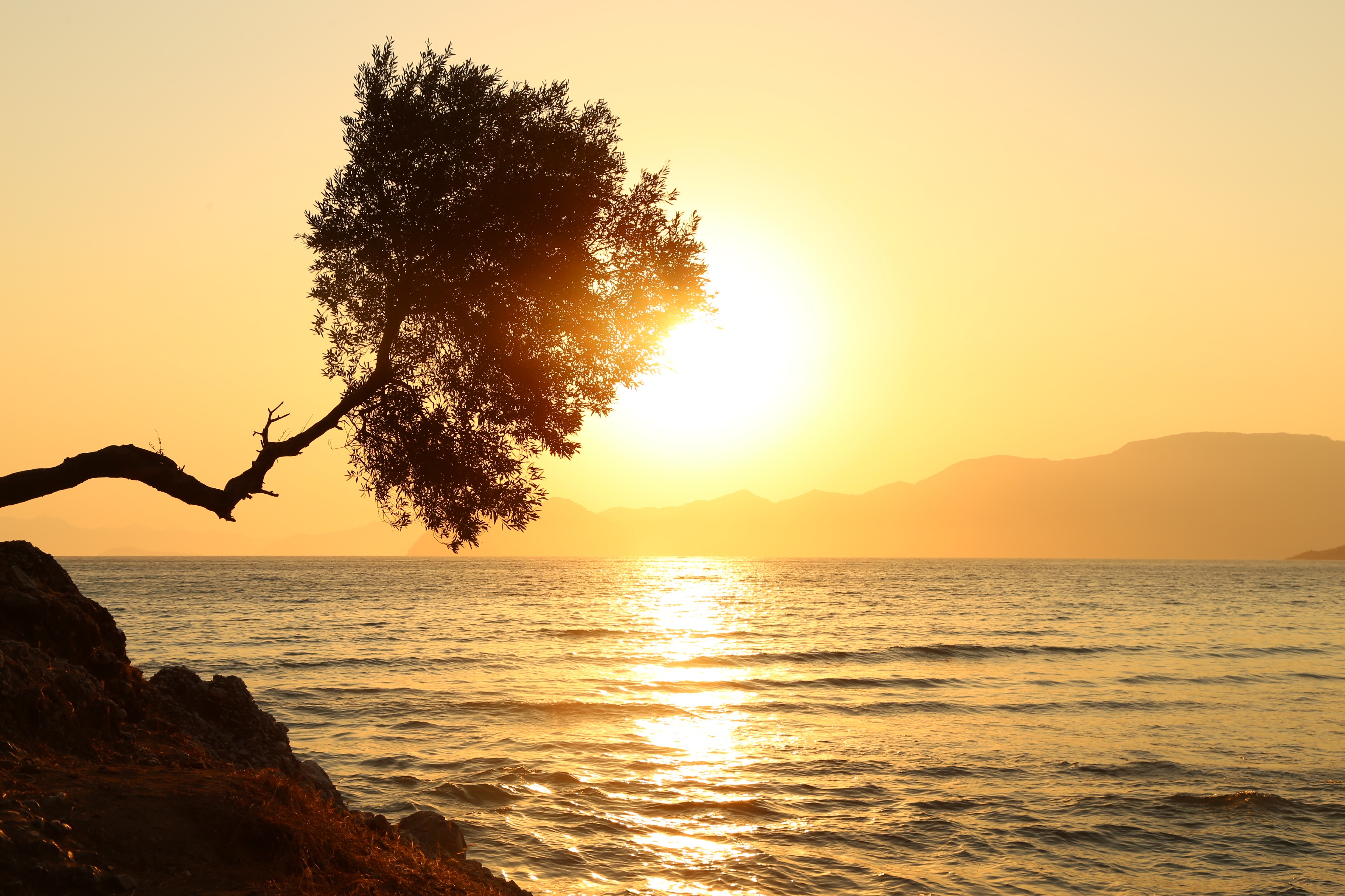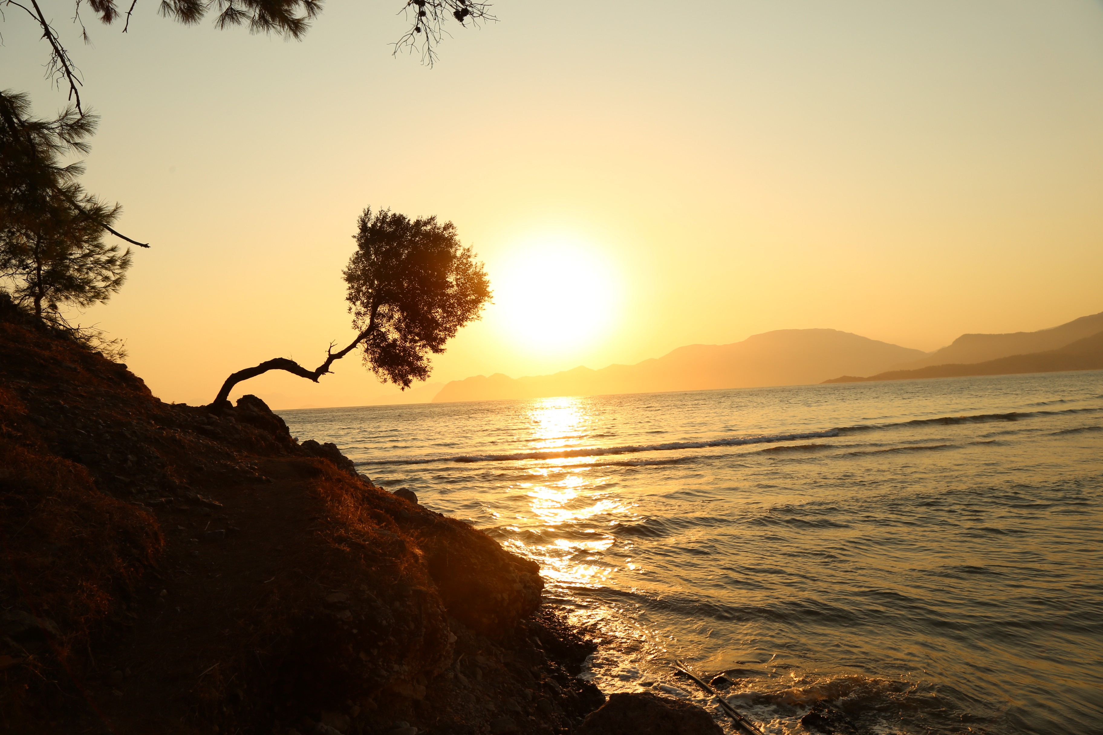 Gün batımı sırasında güneşin renk cümbüşü oluşturması ve barış ve sağlığın sembolü olan sahildeki zeytin ağacı ile birleşmesi görenleri adeta büyüledi.