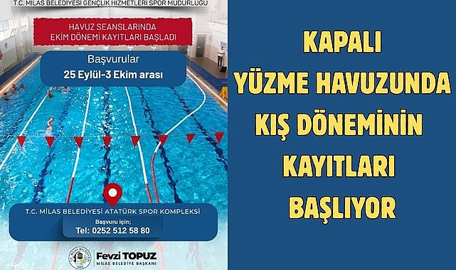 Havuzlar yönetmeliğine uygun olan kapalı yüzme havuzunda bireysel yüzme seanslarının yanı sıra spor kulüpleri de faaliyetlerini sürdürüyor. Ekim ayı döneminde aylık ve günlük olarak üye olunarak Milas Belediyesi Atatürk Spor Kompleksi Kapalı Yüzme Havuzu’nu kullanmak isteyen vatandaşlar havuz üye kayıt işlemleri, seanslar ve ücretler hakkında Milas Belediyesi Gençlik ve Spor Müdürlüğü’ne başvuru yapıp (0252) 512 58 80 numaralı telefondan detaylı bilgi alabiliyor.