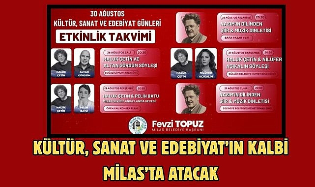 Sanat ile yoğrulmuş ve sanattan beslenen bir kültür oluşturmak adına, şiir ve müzik dinletileri, söyleşi ve anma gecelerinden oluşan 30 Ağustos Kültür Sanat ve Edebiyat Günleri 25-29 Ağustos tarihleri arasında ilçemizin farklı mahallelerinde gerçekleşecek. Bafa, Boğaziçi, Güllük, Ören ve Selimiye’de misafirlerini ağırlayacak olan etkinlikler Milas Belediyesi tarafından vatandaşlarla buluşturulacak.