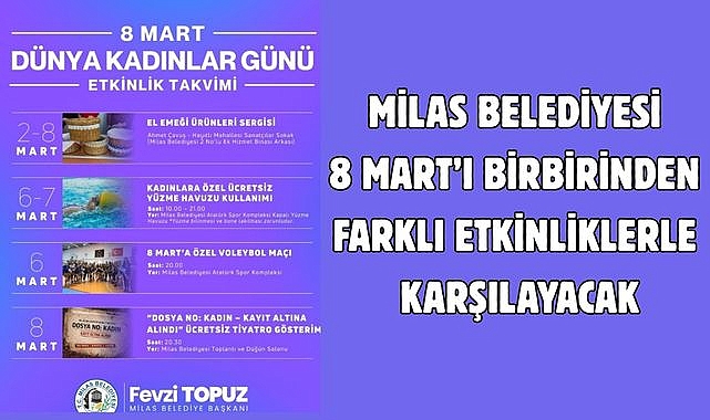 Dolu dolu bir 8 Mart programı hazırlayan Milas Belediyesi tarafından belediye bünyesinde bulunan havuz ücretsiz olarak kadınların kullanımına açılırken, voleybol maçı, tiyatro ve kadın el emeği ürünleri sergisi gerçekleştirilecek.