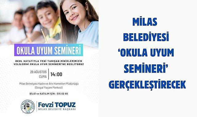 Yeni eğitim-öğretim döneminin başlamasına kısa bir zaman kala eğitim çalışmalarına hız veren Milas Belediyesi, okul hayatlarına yeni adım atacak olan okul öncesi ve ilkokul 1. sınıf öğrencilerinin velilerine yönelik ‘Okula Uyum Semineri’ düzenleyecek.