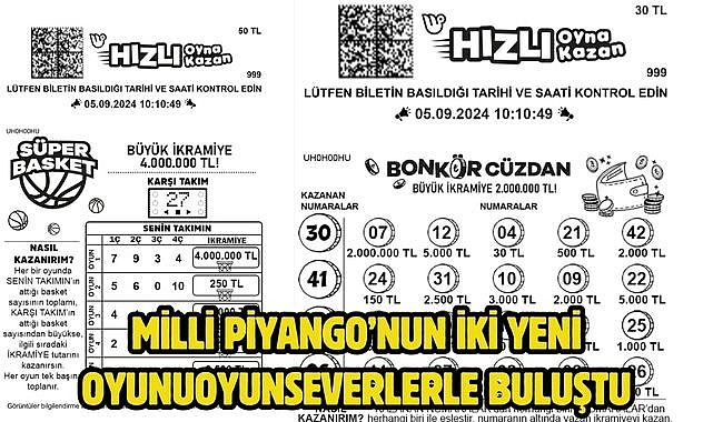 Milli Piyango’nun “Hızlı Oyna Hızlı Kazan” kategorisi kapsamında hayata geçirdiği iki yeni oyunu oyunseverlerle buluştu. Bayilerde yer alan terminallerde oynanabilen “Bonkör Cüzdan” sayı eşleme; “Süper Basket” büyük/küçük sayı kıyaslama prensibine dayanır.