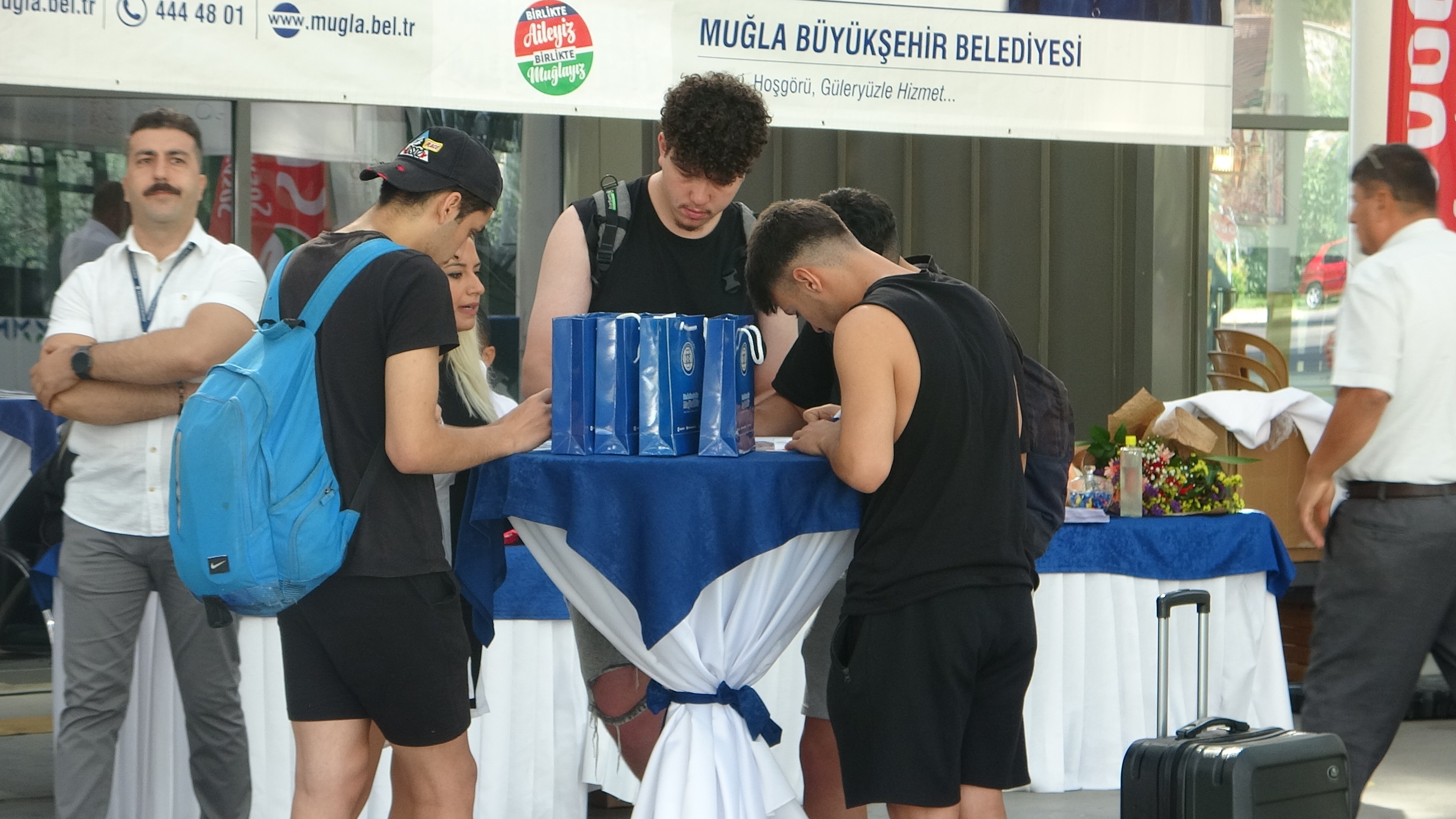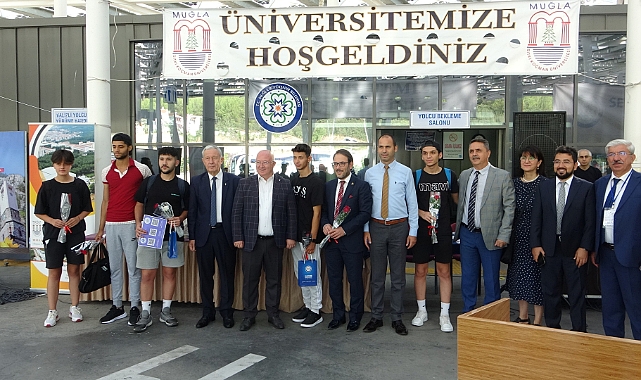 Muğla Sıtkı Koçman Üniversitesi'ne kayıt yaptırmak için gelen öğrencilere protokol üyeleri tarafından çiçek verildi ve toplu olarak hatıra fotoğrafı çekildi.