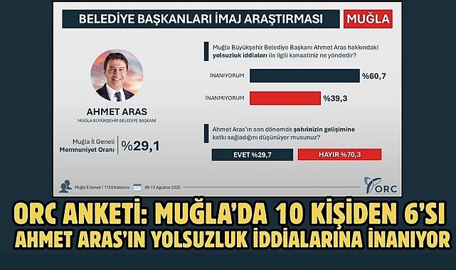 Geçmişte Aras’ı defalarca “Türkiye’nin en beğenilen belediye başkanları” listesine alan ORC, son anketinde son günlerde Başkan Ahmet Aras hakkındaki yolsuzluk iddialarını Muğlalılara sordu ve çok çarpıcı sonuçlar ortaya çıktı.